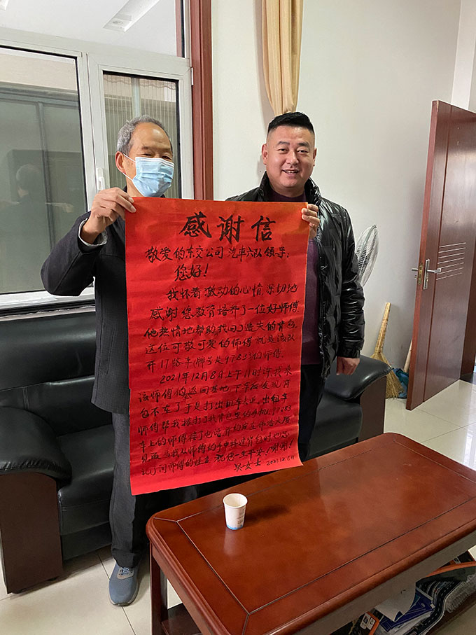 12月9日上午,東營(yíng)市公交公司汽車(chē)六隊(duì)的辦公樓里來(lái)了兩位手捧大紅色感謝信的老人家。上面寫(xiě)著“感謝您教育培養(yǎng)了一位好師傅,他熱情地幫助并找回了遺失的背包?!?br/> 原來(lái),在12月8日上午,家住西城的吳女士和老伴從墾利區(qū)返程時(shí)乘坐了袁永文師傅駕駛的117路公交車(chē),在到達(dá)濟(jì)南路附近下車(chē)后,發(fā)現(xiàn)自己的隨身斜跨的背包不見(jiàn)了。這時(shí)才想到可能是遺落在剛剛的公交車(chē)上,“雖然是個(gè)小破包,里面也就一百來(lái)塊錢(qián),可是手機(jī)、鑰匙、老年卡都在包里?!被叵肫甬?dāng)時(shí)發(fā)現(xiàn)背包丟失后的吳女士非常著急,“手機(jī)還是孩子剛給買(mǎi)的,還新得很呢”。焦急的吳女士便跑到附近的濱海派出所去詢問(wèn)該如何,“人家給我出了個(gè)主意,打上出租車(chē)去追”。吳女士和老伴便急忙攔上了一輛出租車(chē)去追趕。吳女士說(shuō)自己老伴平時(shí)出門(mén)也不帶電話,幸虧出租車(chē)駕駛員人也很好,用自己的電話撥打了吳女士背包里的手機(jī)。當(dāng)時(shí)還在駕駛車(chē)輛的袁永文師傅并不知道這一切,當(dāng)他聽(tīng)到車(chē)廂內(nèi)有電話聲響,經(jīng)乘客提醒得知有個(gè)背包在座位上,考慮到可能是失主在尋找。袁師傅便在下一站把車(chē)??柯愤吅螅瑥陌锬贸鲭娫?,撥了回去,這樣雙方才取得了聯(lián)系。