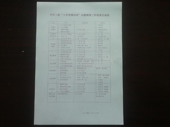 會上,車隊領導首先拋磚引玉,查擺梳理出車隊現(xiàn)行管理中存在的十個方面的問題,逐條進行了深入講解和剖析。隨后,車隊每名管理干部和管理人員也都對照自己的工作職責,從工作履職、工作態(tài)度、工作作風、工作效率四個方面進行了反思和查擺,客觀的分析總結了當前工作中的不足和存在的問題,提出自己整改的具體工作方向、整改步驟、整改的完成期限。