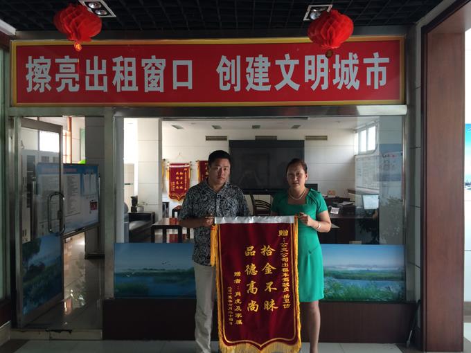 原來(lái),6月22日肖先生搭乘出租車(chē)從黃河鉆井到商業(yè)大廈不慎將錢(qián)包落在魯ET2306出租車(chē)上,包內(nèi)有身份證、銀行卡及現(xiàn)金10000多元,出租車(chē)駕駛員岳偽仿發(fā)現(xiàn)之后立即上交運(yùn)營(yíng)中心,后經(jīng)運(yùn)營(yíng)中心聯(lián)系上失主并及時(shí)歸還。為了感謝駕駛員岳偽仿拾金不昧的精神,肖先生特意送來(lái)錦旗表示感謝。