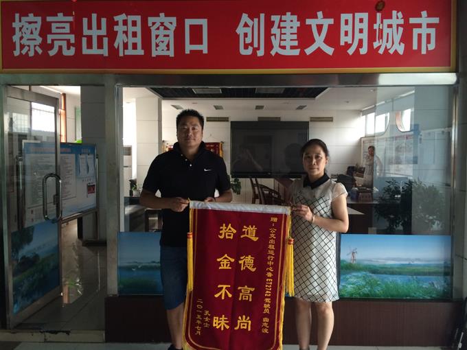 出租車駕駛員曲志波發(fā)現(xiàn)遺失物品后立即送到市公交公司出租運(yùn)營(yíng)中心,在運(yùn)營(yíng)中心的幫助下聯(lián)系上了孔女士,將遺失在出租車上的物品如數(shù)歸還,乘客為了表示對(duì)出租車駕駛員的感謝,于7月27日委托其丈夫送來(lái)錦旗一面。