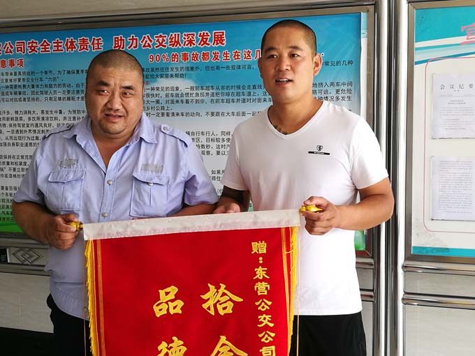 事后,失主拿著錦旗來到市公交公司汽車七隊(duì),找到車隊(duì)領(lǐng)導(dǎo)和駕駛員,感謝拾金不昧的好司機(jī)---楊寶海。