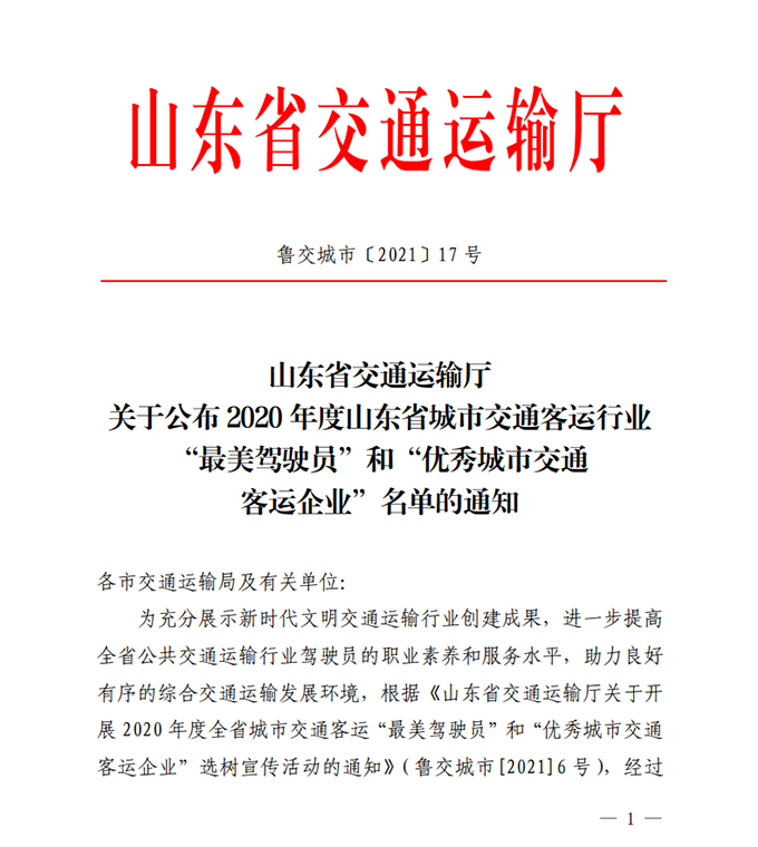 為充分展示新時代文明交通運輸行業(yè)創(chuàng)建成果,進(jìn)一步提高全省公共交通運輸行業(yè)駕駛員職業(yè)素養(yǎng)和服務(wù)水平,助力良好有序的綜合交通運輸發(fā)展環(huán)境,根據(jù)《山東省交通運輸廳關(guān)于開展2020年度全省城市交通客運“最美駕駛員”和“優(yōu)秀城市交通客運企業(yè)”選樹宣傳活動的通知》(魯交城市〔2021〕6號)要求,經(jīng)活動啟動、材料申報、資格審查、公開公示、人選推薦、專家評審等環(huán)節(jié),產(chǎn)生了優(yōu)秀城市交通客運企業(yè)和城市交通客運最美駕駛員名單,市公交公司及兩名駕駛員榜上有名。
