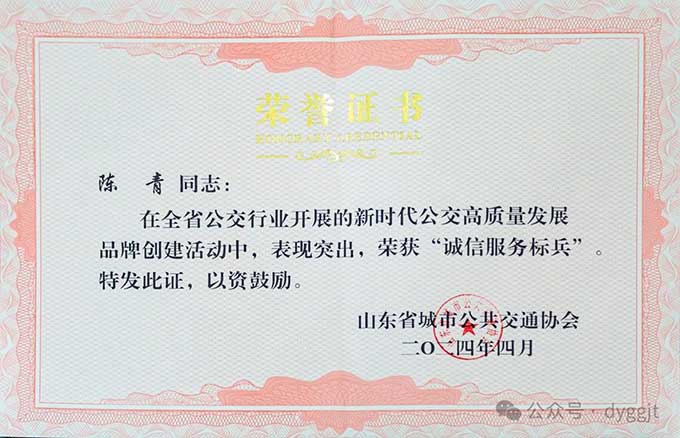 陳青同志于2020年榮獲東營(yíng)市“五一勞動(dòng)獎(jiǎng)?wù)隆?,先后獲得東營(yíng)市第一屆、第二屆城市公交駕駛員安全節(jié)能駕駛大賽中第三名和第一名的優(yōu)異成績(jī),代表東營(yíng)市參加全省城市公交駕駛節(jié)能技能大賽,并取得了優(yōu)異成績(jī)。