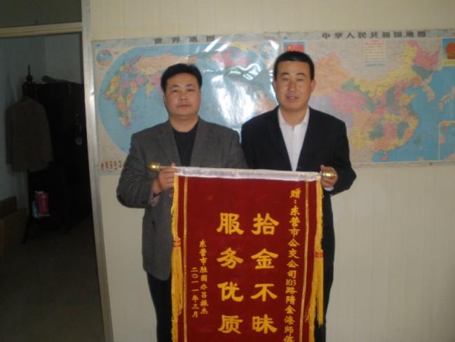 2011年3月14日下午,東營市勝園辦事處的呂振杰手持“拾金不昧,服務(wù)優(yōu)質(zhì)”的錦旗來到市公交公司汽車一隊(duì)。