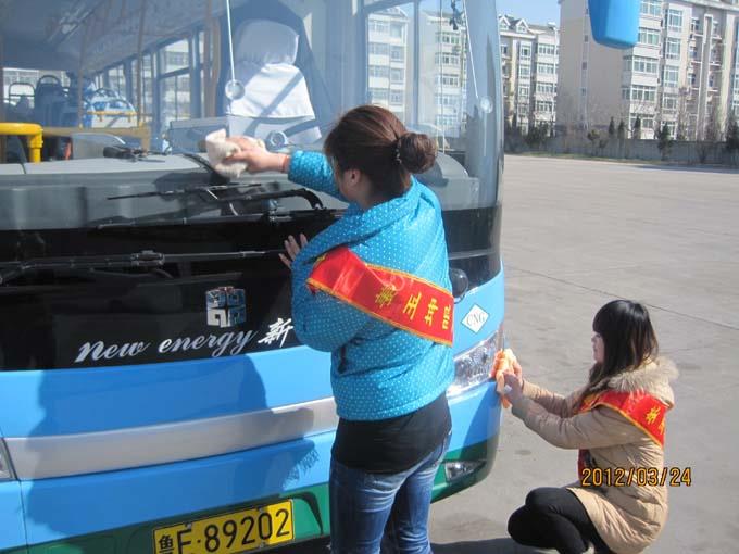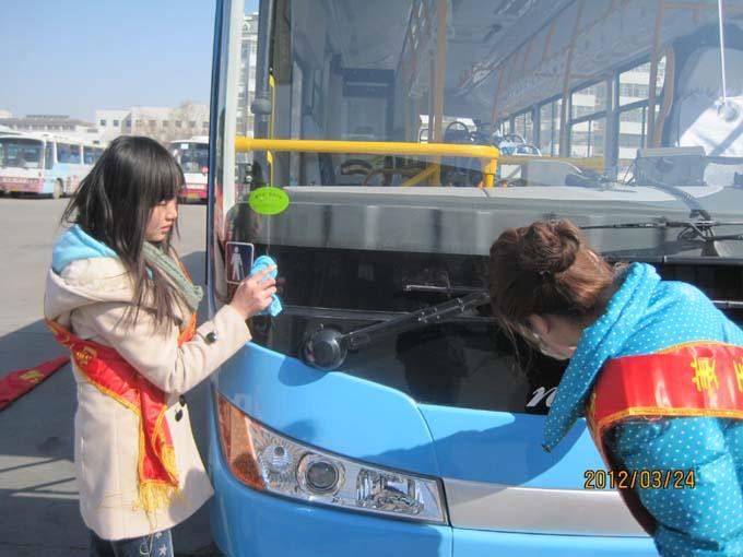 來(lái)自東營(yíng)市職業(yè)學(xué)院經(jīng)濟(jì)系的大學(xué)生和汽車一隊(duì)職工共計(jì)32人,分成兩個(gè)小組,一組乘坐公交車上路為特需乘客服務(wù),幫助疏導(dǎo)乘客;一組幫助駕駛員擦拭車身,清掃車廂衛(wèi)生。大家工作起來(lái)井然有序,有條不紊,尤其活躍在車廂為乘客服務(wù)的志愿者們,更是得到了乘客的一致好評(píng),成為公交車上一道亮麗的風(fēng)景。